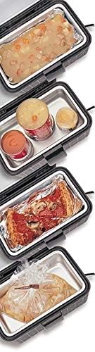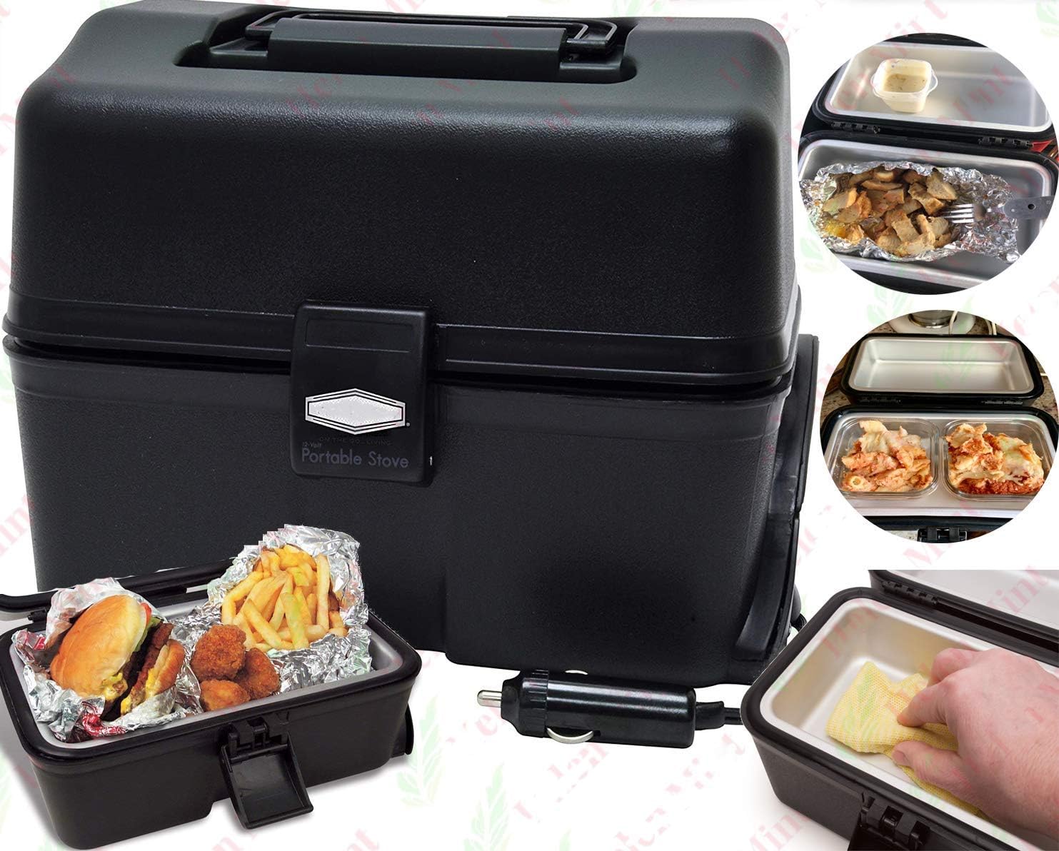 Lunchbox stove, 12 volt, portable, capacity 1 quart, temp range 300 degrees f, includes 3 disposable aluminum pans.